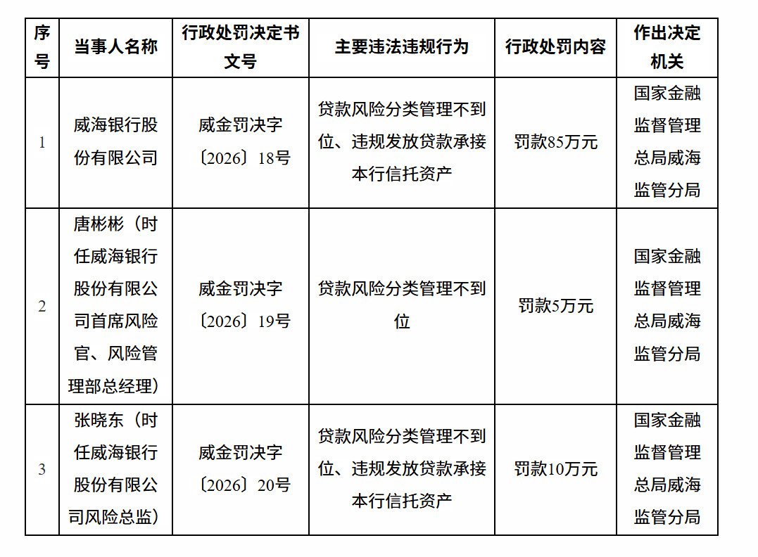 4月7日,国家金融监督管理总局威海监管分局行政处罚信息公开表显示,威海银行股份有限公司因贷款风险分类管理不到位、违规发放贷款承接本行信托资产被罚款85万元。责任人唐某彬被罚款5万元、张某东被罚款10万元。