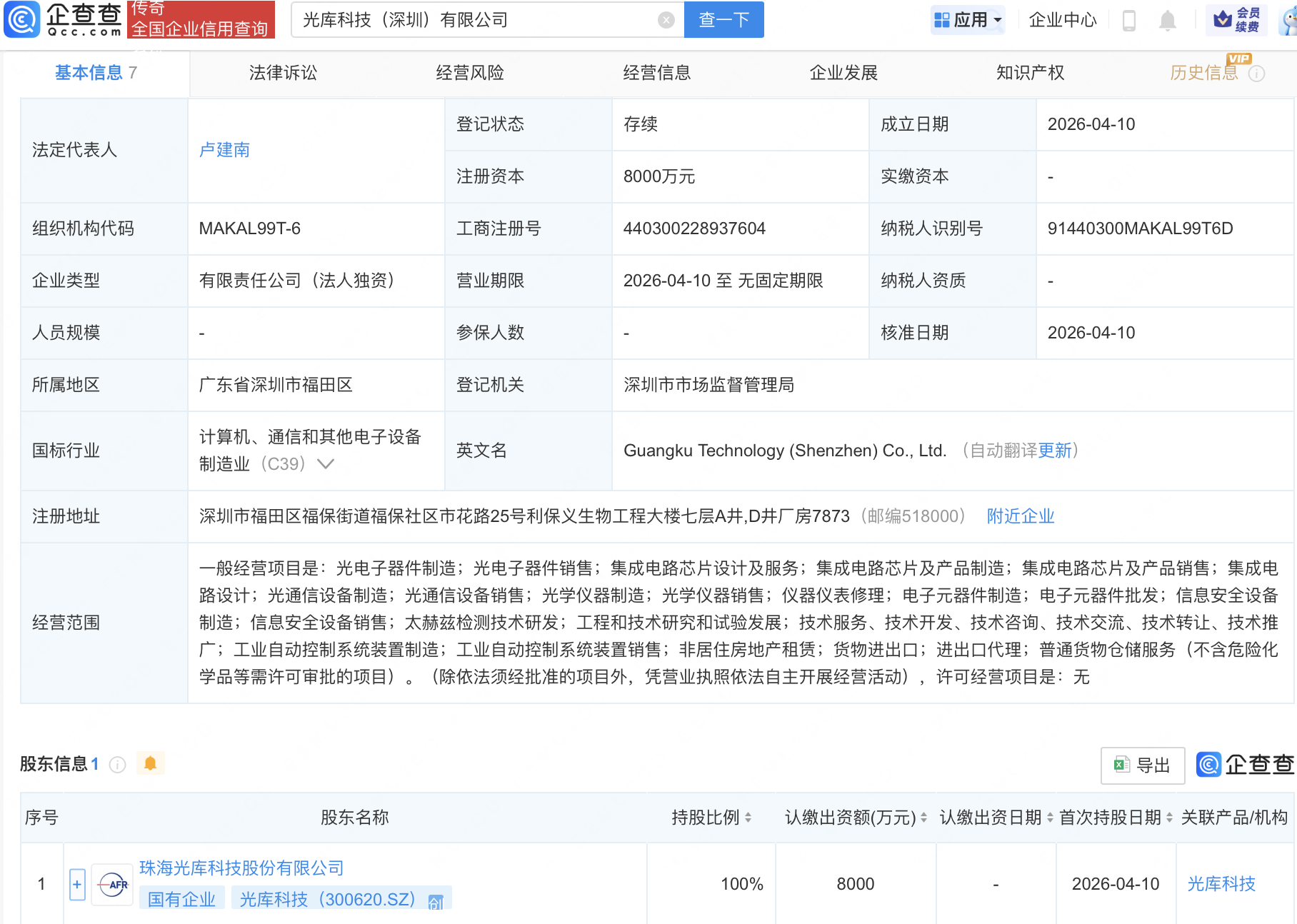 近日,光库科技(深圳)有限公司成立,注册资本8000万元,经营范围包含:集成电路芯片设计及服务;集成电路芯片及产品制造;集成电路芯片及产品销售;集成电路设计等。企查查股权穿透显示,该公司由光库科技(300620)全资持股。