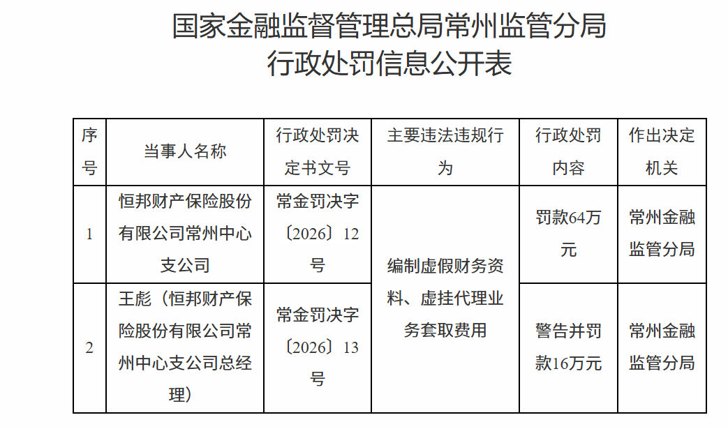 4月10日,国家金融监督管理总局常州监管分局行政处罚信息公开表显示,恒邦财产保险股份有限公司常州中心支公司因编制虚假财务资料、虚挂代理业务套取费用被罚款64万元;责任人王某被警告并罚款16万元。