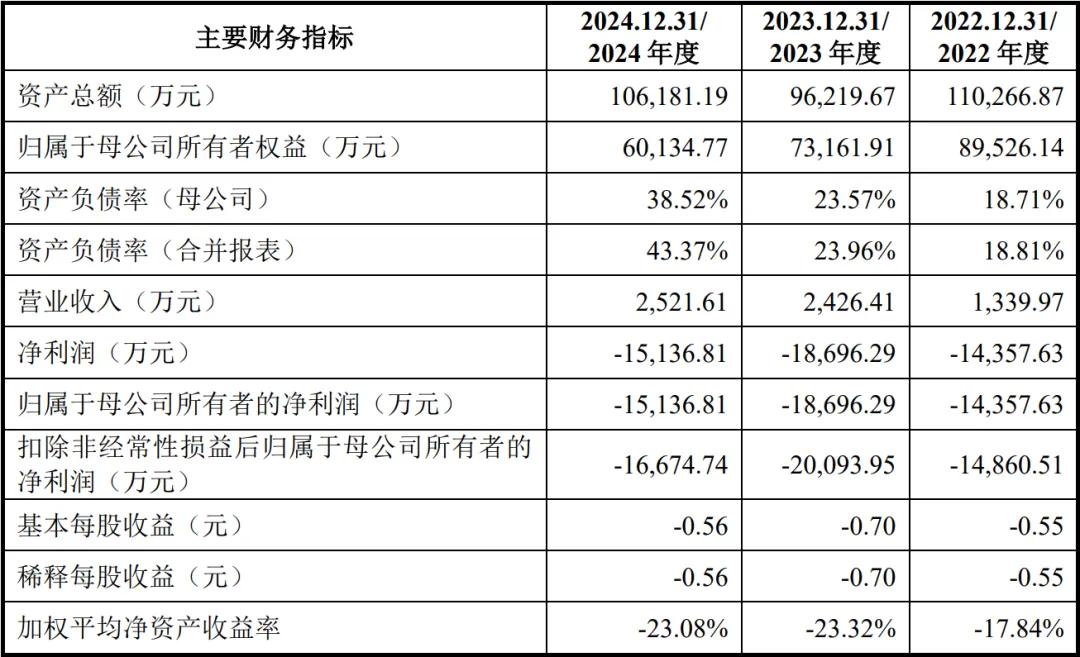 2020年-2022年,公司营业收入分别为37.69万元、97.03万元,2022年营收未披露;对应净利润分别为-6,126.00万元、-13,690.22万元、-18,833.56万元。(来源/大象IPO)
