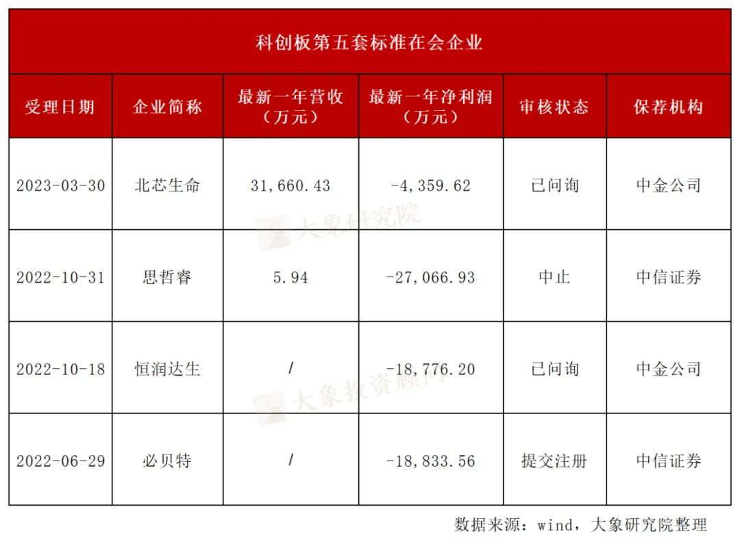 除此之外,北芯生命、思哲睿、恒润达生、必贝特等4家企业也采用的是科创板第五套标准,目前还在排队中。