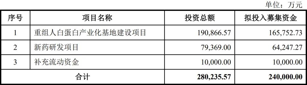 此次IPO拟募集24亿元,用于重组人白蛋白产业化基地建设项目、新药研发项目、补充流动资金。